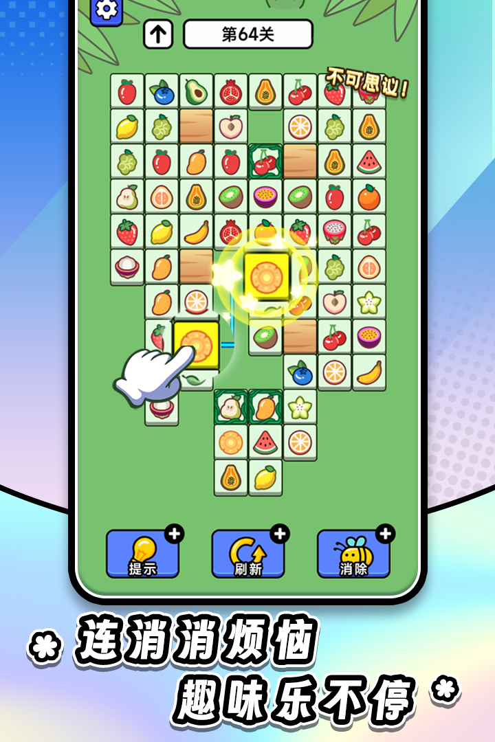 下载《连连看达人全民消一消》是一款打破传统玩法的益智消除游戏,以竖屏布局打造层层递进的闯关体验。游戏延续 “连接相同图案消除” 的核心规则,却在后期关卡融入丰富策略元素,如石砖无法消除无法移动、冰块作为障碍物需相邻方块消除、藤蔓遮挡视线、搭配提示,刷新,蜜蜂等辅助道具,让每一关都充满解谜乐趣!
